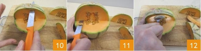 Suivez la forme du melon 10 et terminez en effectuant une coupe horizontale 11; retirez la demi-lune de chair obtenue. Maintenant, vous pouvez creuser à l'aide d'une cuillère pour éliminer les graines 12