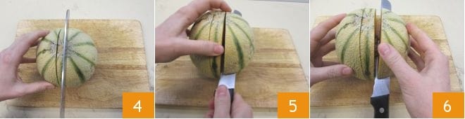 Effectuez ensuite une découpe identique et parallèle, en l'éloignant de l'autre d'environ 3 cm 4. Enfoncez également dans ce cas le couteau jusqu'à la moitié du melon, comme si vous vouliez en couper une tranche. Coupez maintenant l'un des deux quartiers latéraux obtenus et retirez-le (5-6)