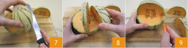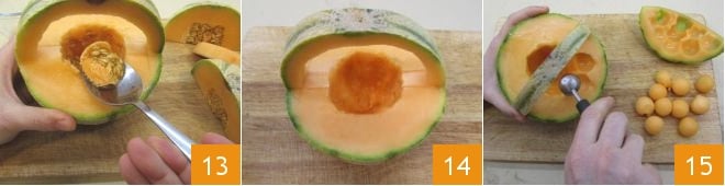 et les filaments du cœur du melon (13-14). Rassemblez la chair du fruit en petites sphères à l'aide d'une cuillère parisienne 15