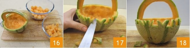 en les recueillant dans un récipient au fur et à mesure qu'elles sont prêtes, jusqu'à ce que le melon soit complètement vidé 16. A l'aide d'un couteau à lame bien aiguisée, incisez maintenant les bords du panier obtenu, jusqu'à lui donner un profil festonné (17-18).