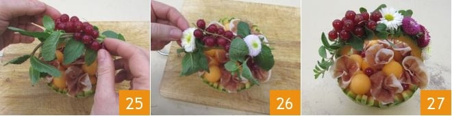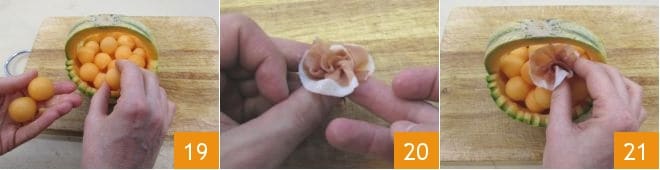 C'est le moment de remplir le panier : placez à l'intérieur les sphères de chair de melon 19 et les petites roses obtenues en enroulant en bouton les tranches de jambon (20 et 21),