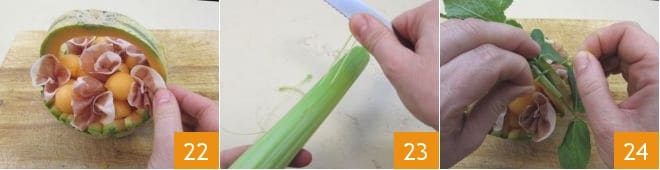 en les disposant à intervalles réguliers pour leur donner l'aspect composé d'un bouquet 22. Réalisez maintenant des fils de céleri, en retirant délicatement à l'aide d'un petit couteau quelques longs filaments externes comme sur la photo 23. Utilisez les fils de céleri pour attacher au manche du panier de melon les brins de menthe fraîche 24,