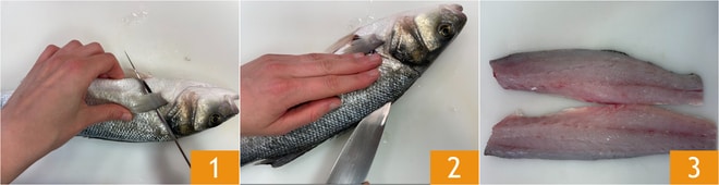 Pour préparer le ceviche de bar, la première chose à faire est de nettoyer le poisson. Écaillez-le sous l'eau courante, puis faites une incision sur le ventre et éviscérez-le, passez-le à nouveau sous l'eau courante pour éliminer les impuretés éventuelles. Faites une incision oblique, peu après les branchies 1, qui part du dos et rejoint l'incision faite précédemment sur le ventre. Incisez la queue et la partie dorsale du poisson en suivant la colonne vertébrale 2 pour obtenir le premier filet, répétez la même procédure pour le second 3.