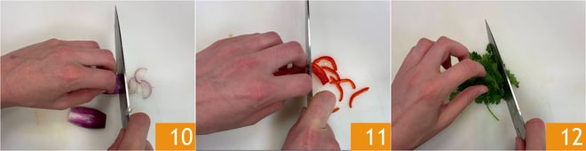 Hachez finement au couteau : l'oignon 10, le piment 11, après l'avoir épépiné, et la coriandre 12.