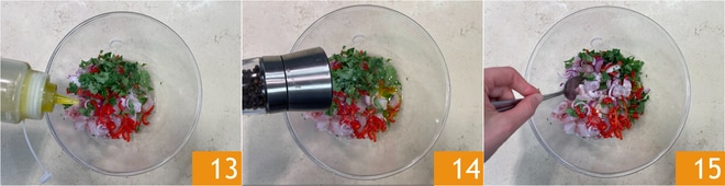 Ajoutez le tout au bar, assaisonnez avec de l'huile 13, du sel et du poivre 14 et mélangez délicatement 15. Couvrez avec du film plastique et laissez mariner au réfrigérateur pendant 15 à 20 minutes pour faire se mélanger les saveurs.