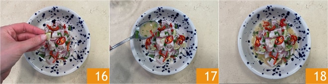 Dressez sur l'assiette, en garnissant de feuilles de coriandre fraîche et de rondelles de lime 16, complétez avec une cuillerée de marinade 17. Le ceviche de bar est prêt à être servi 18.