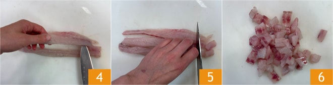 Coupez les filets de bar d'abord en lanières 4 puis en dés de taille uniforme 5 6.