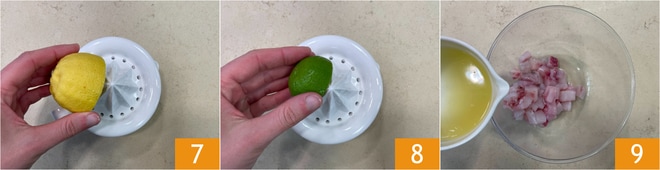 Pressez le citron 7 et le lime 8 et versez le jus sur les dés de bar 9.