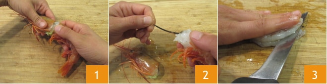 Pour préparer le ceviche de crevettes, commencez par nettoyer les crevettes : retirez la tête et la carapace 1, puis incisez le dos et retirez l'intestin 2. Enfin, divisez les crevettes nettoyées en deux en les coupant dans le sens de la longueur avec un couteau bien aiguisé 3. Mettez de côté pour le moment.