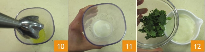Mixez avec un mixeur plongeant 10 jusqu'à obtenir une consistance homogène 11, puis ajoutez la coriandre 12,