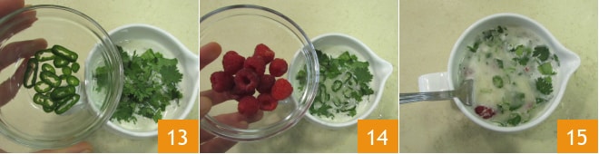 le piment coupé en rondelles 13 et les framboises fraîches 14. Mélangez délicatement pour bien amalgamer le tout 15.