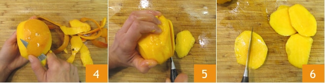 Pelez la mangue 4 et découpez 8 tranches assez fines 5, en divisant les plus grandes tranches en deux 6. Mettez de côté et passez à l'émulsion.
