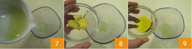 Versez le jus de citron vert dans un récipient haut et étroit 7, puis ajoutez le gingembre frais en morceaux 8, l'huile 9 et le sel.