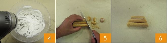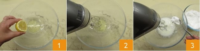 Pour préparer le chalet de boudoirs, commencez par réaliser le Glaçage royal. Versez les blancs d'œufs dans un bol, ajoutez 2-3 gouttes de jus de citron 1; commencez à monter avec le batteur électrique 2 et ajoutez peu à peu le sucre glace 3,