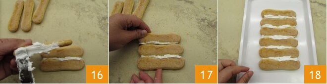 Préparez maintenant les deux parties du toit : pour chacune, vous devrez assembler 6 boudoirs. Cette fois, cependant, le glaçage devra être appliqué sur le côté de chaque boudoir 16. Alignez-les entre eux en les faisant bien adhérer 17 et laissez sécher également ceux-ci 18. Pendant ce temps, couvrez le glaçage avec un chiffon humide et mélangez-le de temps en temps.