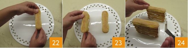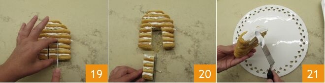 Seulement lorsque tout sera complètement sec et solidifié, vous pourrez commencer à composer le chalet de boudoirs. Prenez l'une des deux façades de 8 boudoirs et en utilisant un couteau dentelé, créez la porte. Vous devrez découper un rectangle bien centré d'environ 3 cm de large et aussi long que 4 boudoirs (19-20). Maintenant, reprenez la partie latérale désormais sèche (celle formée de 5 boudoirs) et enduisez la base de glaçage 21