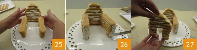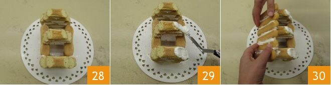 Préparez ensuite 3 autres boudoirs qui seront vos poutres, ils aideront à soutenir le toit : taillez-les toujours en oblique (comme fait au passage 5, en respectant les mêmes dimensions du plus grand au plus petit) et en utilisant le glaçage royal, collez-les au milieu des 2 blocs latéraux 28. À ce stade, laissez sécher complètement. Ensuite, étalez le glaçage sur les découpes obliques 29, puis très délicatement, posez un côté 30,
