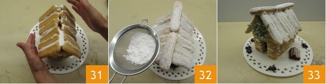 et puis l'autre 31. Prenez ensuite 2 autres boudoirs, étalez le glaçage sur la base et positionnez-les en longueur, l'un après l'autre, à l'endroit où les deux côtés du toit se rejoignent. Saupoudrez le tout de sucre glace 32. Ensuite, préparez la couronne en entrelaçant deux brindilles de romarin, en les pinçant avec une agrafeuse si nécessaire pour les maintenir ensemble. Coincez un morceau de cure-dent entre deux boudoirs, dans le glaçage, et utilisez-le pour accrocher la couronne. Décorez le chalet avec des morceaux d'anis étoilé et avec des bâtons de cannelle, en les disposant comme si c'était un tas de bois.