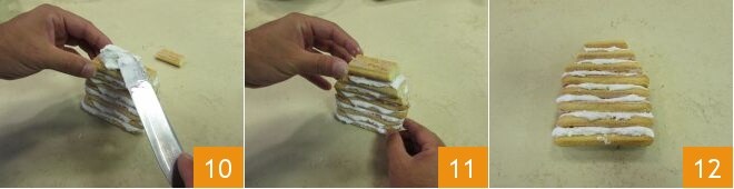 Récupérez le trapèze préparé, vous devrez également coller les trois boudoirs qui composent le trapèze réalisé précédemment, du plus grand au plus petit, en les alternant toujours avec le glaçage pour qu'ils adhèrent entre eux (10-11-12).
