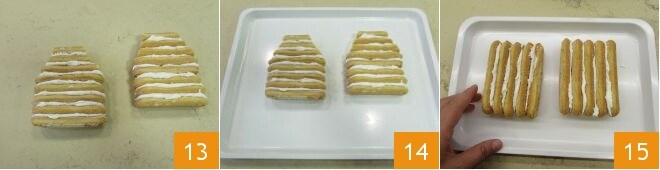 Préparez un autre bloc identique à celui-ci (il constituera l'arrière du chalet), en répétant toutes les opérations faites (du passage 8 au 12). À ce stade 13, laissez sécher les deux blocs en les transférant délicatement sur un plateau 14. Pendant ce temps, préparez également les deux blocs latéraux : cette fois, il suffira d'assembler 5 boudoirs entiers par bloc, en étalant toujours le glaçage entre chaque boudoir 15. Puis laissez sécher toujours à température ambiante sur un plateau. Les temps de séchage peuvent varier ; ne soyez pas pressé et assurez-vous que toutes les pièces soient bien collées avant de continuer.