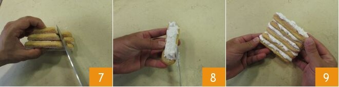 Réalisez-en un autre, toujours avec 3 boudoirs, comme celui fait précédemment (que vous pourrez utiliser comme modèle pour qu'ils aient les mêmes dimensions) 7. Mettez de côté. Prenez un autre boudoir entier, recouvrez une des bases avec le glaçage royal 8, placez un autre boudoir par-dessus le glaçage et recouvrez à nouveau de glaçage. Continuez ainsi jusqu'à assembler 5 boudoirs entiers 9.