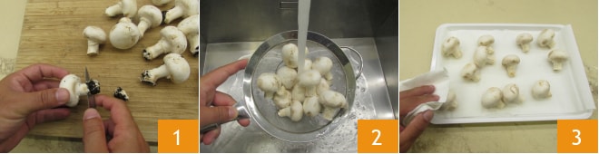 Pour réaliser les champignons de Paris farcis à la saucisse, commencez par nettoyer les champignons : retirez la base du pied qui est plus terreuse 1. S'ils sont très sales, vous pouvez les rincer très rapidement (attention car les champignons absorbent facilement l'eau et peuvent se détériorer) 2 et bien les sécher mais délicatement avec un chiffon 3, afin d'éliminer tous les résidus de terre.