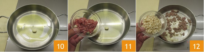 Faites chauffer un peu d'huile dans une poêle avec une gousse d'ail non pelée 10, dès que l'huile est bien chaude ajoutez la saucisse 11 et faites-la revenir pendant 3-4 minutes, puis ajoutez les pieds de champignon 12, salez et poivrez.