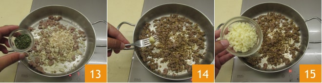 Assaisonnez avec le hachis de romarin 13 et laissez cuire encore 2 minutes à feu vif. Éteignez le feu, retirez l'ail 14 et ajoutez la provola douce 15.