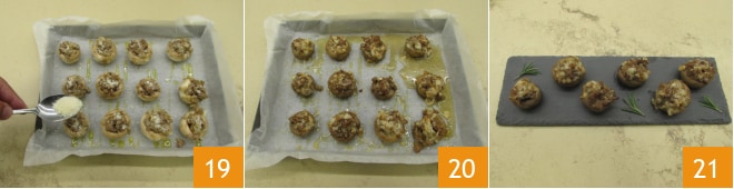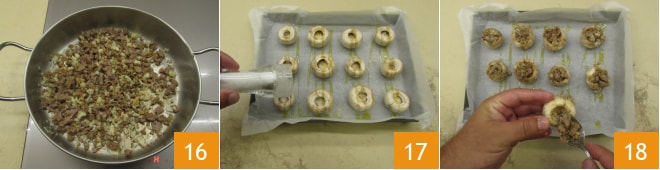 Mélangez pour assaisonner, la farce est prête 16. Huilez et salez les chapeaux de champignons précédemment déposés sur une plaque avec du papier sulfurisé 17, farcissez-les avec la farce de saucisse et provola 18.