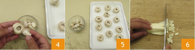 Détachez les pieds en faisant attention à ne pas casser ou fendre le chapeau du champignon 4 et conservez-les séparément 5. Hachez la provola 6.