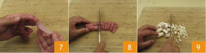 Retirez la peau de la saucisse 7 et réduisez la viande en une fine hachée 8. Hachez également les pieds de champignons mis de côté 9.