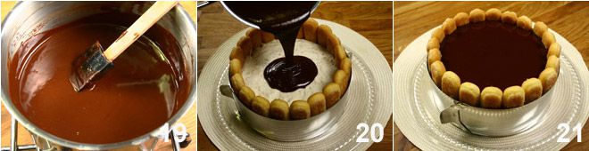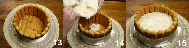 Continuez en disposant également les biscuits à la cuillère au fond 13 et versez le mélange de nougat à l'intérieur (14-15). Recouvrez la charlotte avec une feuille de papier aluminium et laissez reposer au réfrigérateur pendant 4 heures.