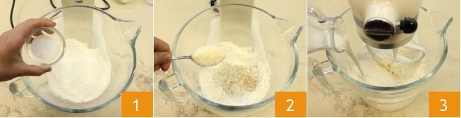 Pour réaliser la charlotte salée, commencez par préparer le pain brioché : tamisez les farines dans le bol d'un pétrin avec la feuille. Ajoutez le sucre 1, la noix de muscade râpée, le parmesan râpé 2 et la levure déshydratée. Actionnez la feuille à vitesse moyenne et incorporez également les liquides : le lait 3 et l'eau à température ambiante.