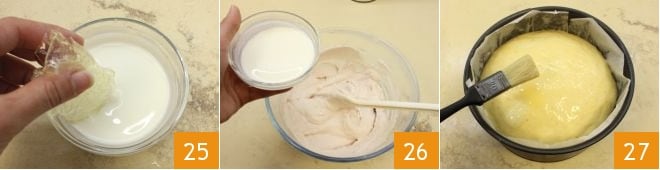 Égouttez la dose restante de gélatine en feuilles, essorez-la bien et faites-la fondre dans 50 ml de crème chaude 25. Ajoutez le mélange à la crème au jambon 26, mélangez soigneusement et couvrez avec le film plastique : placez les deux crèmes au réfrigérateur pour qu'elles se raffermissent pendant au moins deux heures. Pendant ce temps, reprenez les pâtes levées, badigeonnez avec l'œuf battu le gâteau 27