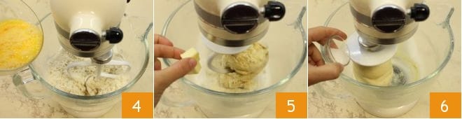 Battez les œufs avec une fourchette et incorporez-les à la pâte peu à peu 4 en continuant de pétrir. Lorsque les ingrédients sont bien rassemblés autour de la feuille, arrêtez le robot, remplacez la feuille par le crochet et actionnez à nouveau la machine ; ajoutez le sel 5 et le beurre ramolli à température ambiante en morceaux peu à peu 6, en attendant qu'un morceau soit absorbé avant d'en ajouter un autre. Faites en sorte que la pâte s'accroche au crochet jusqu'à ce qu'elle soit lisse et homogène.