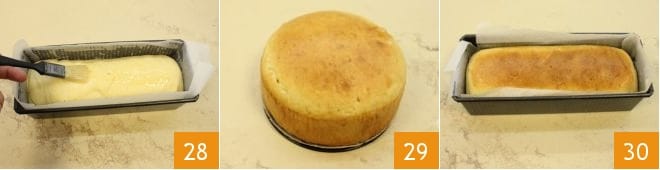et le cake 28 et cuisez-les dans un four statique préchauffé à 180°C pendant 30 minutes (le cake) et pendant 40 minutes (le gâteau) si four ventilé à 160°C pendant 20-30 minutes). Vous pouvez les cuire ensemble et défourner d'abord le cake. Une fois la cuisson terminée, sortez les pâtes du four et laissez-les refroidir (29-30).