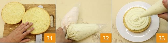 Découpez le chapeau de la base ronde pour avoir une surface régulière, puis divisez le pain brioché rond en 3 couches 31 comme s'il s'agissait d'un gâteau éponge (pour plus de détails, consultez la Comment couper le gâteau éponge). Reprenez les crèmes, transférez-les dans deux poches à douille jetables sans douille 32 et garnissez le pain brioché en réalisant des cercles concentriques en partant de l'extérieur 33