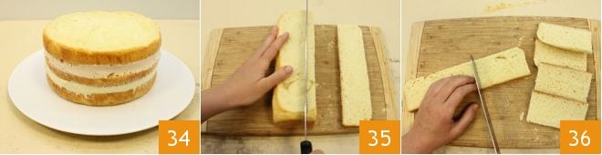 en alternant les goûts entre chaque couche 34 ; avec le reste de la crème, recouvrez également toute la surface et le bord. Placez la charlotte au réfrigérateur ; entre-temps, démoulez l'autre pâte en forme de cake, découpez la surface pour égaliser la forme, découpez la croûte et réalisez des tranches de 1 cm d'épaisseur dans le sens de la longueur 35. De celles-ci, découpez des rectangles d'environ 1,5x2 cm 36.