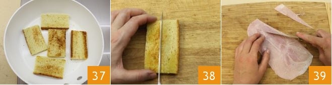 Vous devez obtenir environ 20 tranches à griller à la poêle avec un filet d'huile des deux côtés 37, puis divisez les tranches en deux et réservez-les 38. Maintenant, garnissez la charlotte : des tranches de jambon découpez des petits triangles 39,