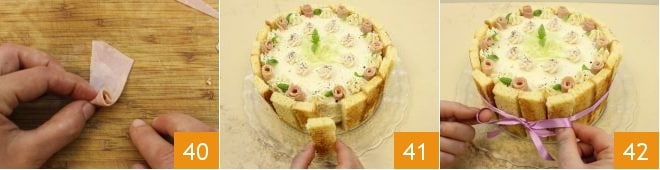 roulez-les pour créer des petites roses 40. Reprenez la charlotte du réfrigérateur et décorez-la avec les tranches grillées de pain brioché disposées tout autour du périmètre, côte à côte 41 et répartissez sur la surface les petites roses en les alternant avec des touffes de crème, des petites feuilles de basilic. Au centre, disposez les lamelles de poireau mises de côté et enfin saupoudrez de graines de pavot. Dernière touche raffinée : enveloppez la charlotte avec un ruban de satin 42. Votre charlotte salée est prête à être servie.