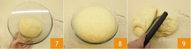 Transférez la pâte sur le plan de travail et travaillez-la pour lui donner une forme sphérique. Placez-la dans un grand bol, couvrez avec du film plastique 7 et laissez lever pendant 30 minutes dans le four éteint avec la lumière allumée. Reprenez la pâte qui aura doublé de volume 8, divisez-la en deux parties 9 dont une pesant 650 g.