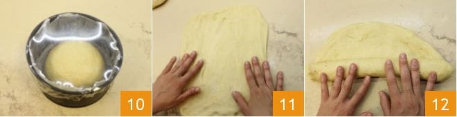 Modelez-la en lui donnant une forme sphérique, puis placez-la dans un moule beurré et chemisé de papier sulfurisé d'un diamètre de 18 cm et d'un bord de 10 cm, comme celui du panettone, couvrez avec du film plastique 10 et laissez lever pendant 2 heures dans le four éteint avec la lumière allumée. Étalez le reste de la pâte en une feuille rectangulaire 11, roulez-la du côté le plus court pour former un petit pain avec la partie de fermeture vers le bas 12.