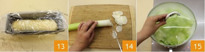Beurrez et chemisez de papier sulfurisé un moule à cake de 26x10 cm et introduisez à l'intérieur le petit pain de pâte, couvrez avec le film plastique 13 transparent et laissez lever pendant deux heures dans le four éteint avec la lumière allumée. Pendant ce temps, commencez à préparer les crèmes de garniture : éliminez la partie la plus externe des poireaux, lavez-les, tranchez-les finement 14, réservez quelques filaments pris de la partie la plus tendre pour garnir la charlotte. Faites-les mijoter avec un filet d'huile dans une poêle avec le couvercle 15