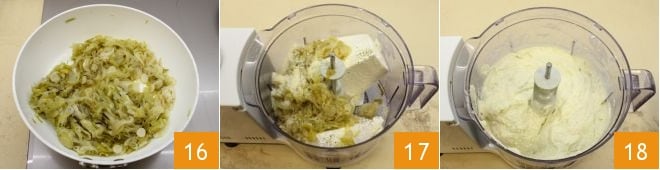 jusqu'à ce qu'ils soient tendres 16 : cela prendra environ 30 minutes. Laissez-les refroidir, puis versez-les dans le mixeur avec la ricotta 17, 1 cuillère à soupe de parmesan, une pincée de sel et de poivre. Mixez les ingrédients pour obtenir une crème homogène 18, passez-la au tamis pour la rendre plus veloutée et transférez-la dans un bol.