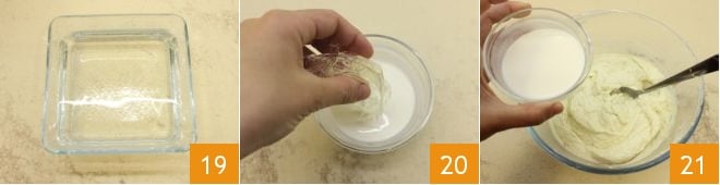 Entre-temps, mettez à tremper dans deux petits bols différents avec de l'eau froide les 3 g de gélatine (pour la crème aux poireaux) et dans l'autre 1 g de gélatine (pour la crème au jambon), pendant au moins 10 minutes 19. Une fois le temps écoulé, égouttez les 3 g de gélatine en feuilles, essorez-les bien et faites-les fondre dans 50 ml de crème chaude 20, en remuant jusqu'à dissolution complète de la gélatine. Ajoutez ensuite le mélange à la crème de ricotta 21