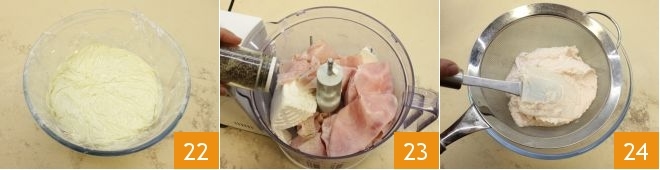 mélangez avec une cuillère puis passez la crème au tamis pour la rendre plus veloutée, couvrez avec du film plastique au contact 22 : placez la crème au réfrigérateur pour qu'elle raffermisse et consacrez-vous à la crème au jambon : mettez dans le mixeur la ricotta, les tranches de jambon cuit, du sel, un filet d'huile d'olive, la noix de muscade et le poivre 23. Mixez le tout pour obtenir une crème homogène puis passez-la au tamis et recueillez-la dans un bol 24.