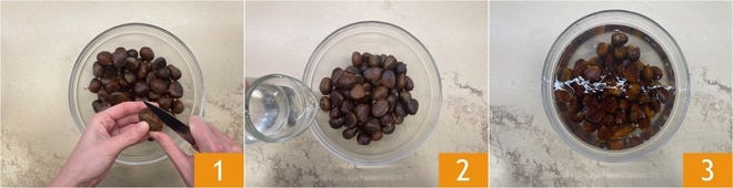 Pour préparer les châtaignes à la friteuse à air, commencez par réaliser une incision horizontale sur toutes les châtaignes à l'aide d'un petit couteau 1. Placez-les dans un bol et recouvrez-les d'eau 2. Laissez-les tremper pendant 2 heures 3. À ce stade, vous pourrez éliminer les châtaignes défectueuses.