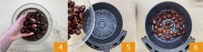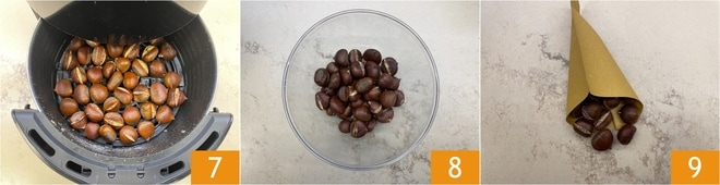 Faites cuire à 160°C pendant environ 15 minutes ou jusqu'à ce que l'incision des châtaignes soit bien ouverte 7. Les châtaignes à la friteuse à air sont prêtes 8, il ne vous reste plus qu'à les servir 9.