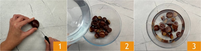 Pour préparer les châtaignes à la poêle, commencez par pratiquer une incision transversale sur le dessus des châtaignes 1. Mettez-les dans un bol, couvrez-les d'eau froide 2 et laissez-les tremper pendant 15 minutes 3.