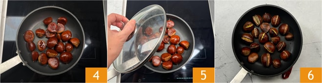 Égouttez et séchez les châtaignes. Transférez-les dans une poêle à fond épais, en les disposant en une seule couche 4, couvrez avec un couvercle 5 et faites cuire à feu moyen pendant 15 minutes, en secouant la poêle de temps en temps. Les châtaignes doivent être bien grillées mais tendres à l'intérieur, cela se produit grâce à la vapeur qui se développe dans la poêle grâce à la présence du couvercle. Vos châtaignes à la poêle sont prêtes à être dégustées 6.